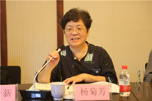 Ms. Yang Jufang giving a speech in memorial of Ven. Muyu