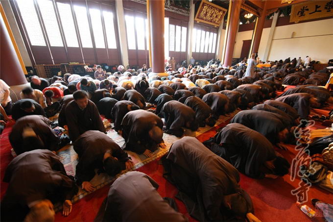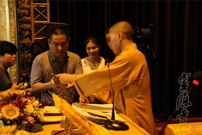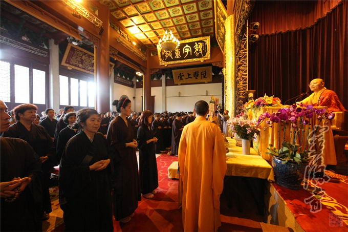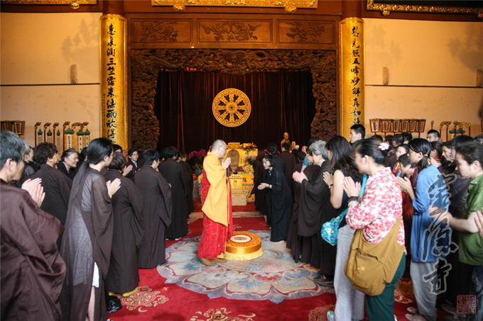 At three o’clock in the afternoon, with solemn Buddhist music in the background which accompanied the welcoming ceremony for Triratna (TripleGem) and various Buddhas, Abbot Venerable Guangquan was invited by the audience to head for the Main Hall, where he would host the ceremony. During the ceremony he would raise the Dharma-sana and preach the Buddhist dharma, and help the sincere disciples of Buddha through the conversion.