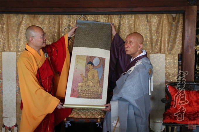 Ven.Guangquan presents Senior Master Takenori Shunan with silk scroll image of Lingyin Temple’s Shakyamuni Buddha statue