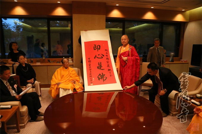 Later in the afternoon, the group met with masters of Agon Shu Honzan, and was warmly welcomed by founder Seiyu Kiriyama. Venerable Quangquan presented gifts and offerings, and invited Senior Seiyu Kiriyama for a visit to Lingyin Temple in the future in an effort to deepen the relationship between the two Buddhist sects.