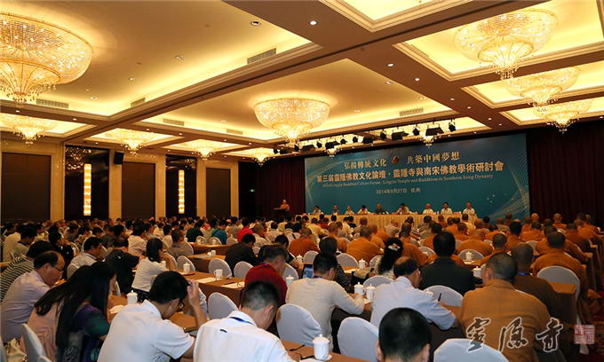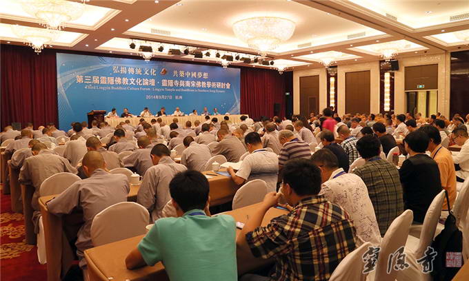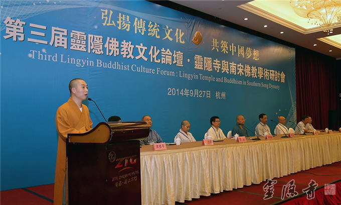 Lingyin Temple’s third annual Culture Forum "Lingyin Temple and Buddhism in Southern Song Dynasty" was held on September 27, 2014, at Zhejiang Hotel in Hangzhou. The forum attracted over 130 senior Buddhist masters, notable academic scholars, experts, university professors and dignitaries from South Korea, Japan, the United States, Singapore, Taiwan, Beijing, Guangzhou, Xiamen and other parts of the country. Special guests included Deputy Director of Zhejiang Ethnic and Religious Affairs Committee Mo Xingfu, Deputy Commissioner of United Front Work Department of Hangzhou Municipal Committee and Party Secretary-General of Hangzhou Municipal Bureau of Ethnic and Religious Affairs Yang Zhigang, Chairman of Hangzhou Buddhist Association Abbot Venerable Guangquan, and Vice-chairman of Hangzhou Buddhist Association Master Zhiyuan, to name just a few.