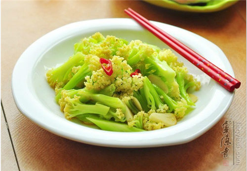 5.倒入烫好的菜花,加入豉油翻炒均匀,起锅装盘。
