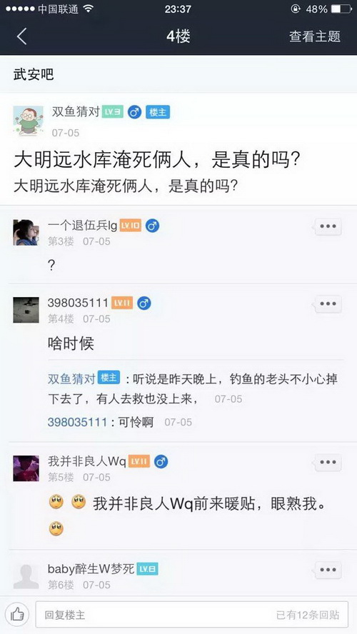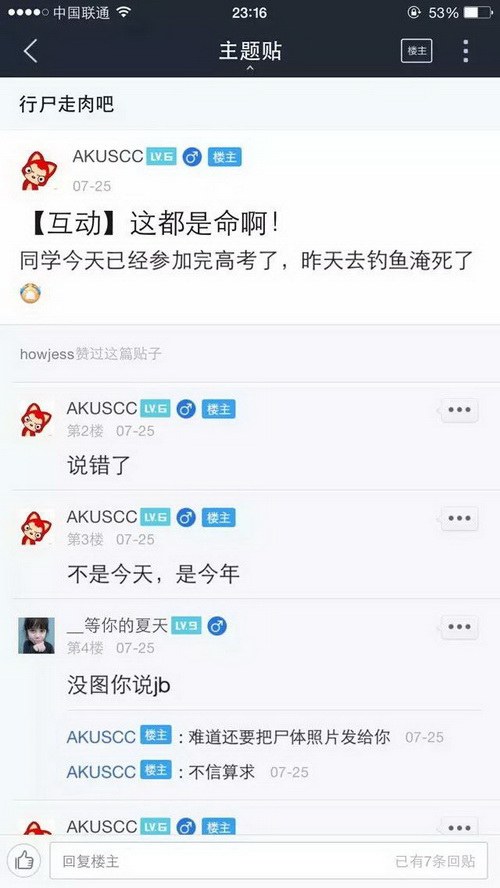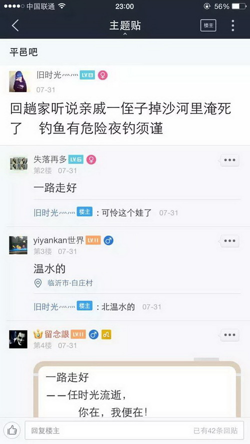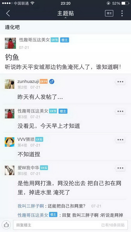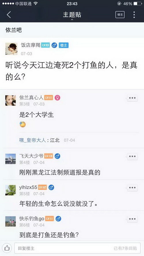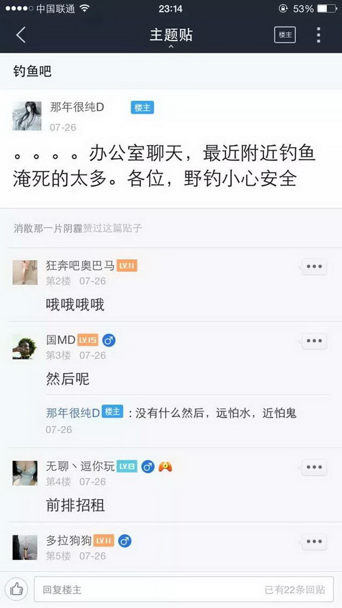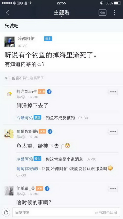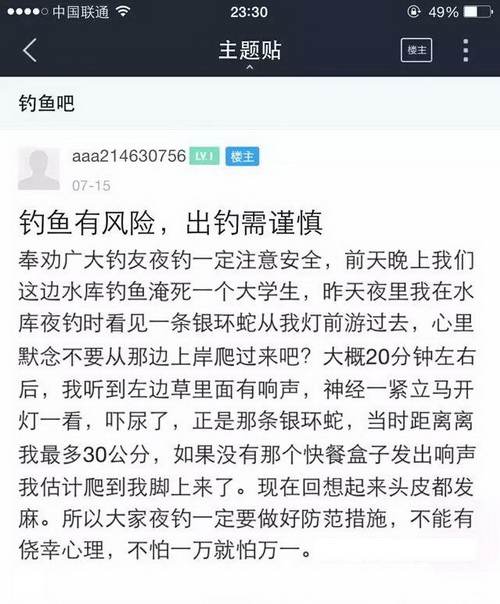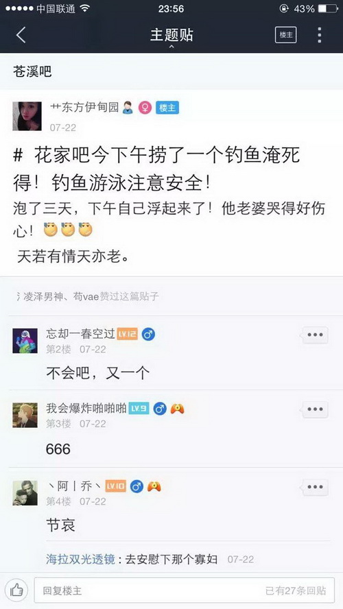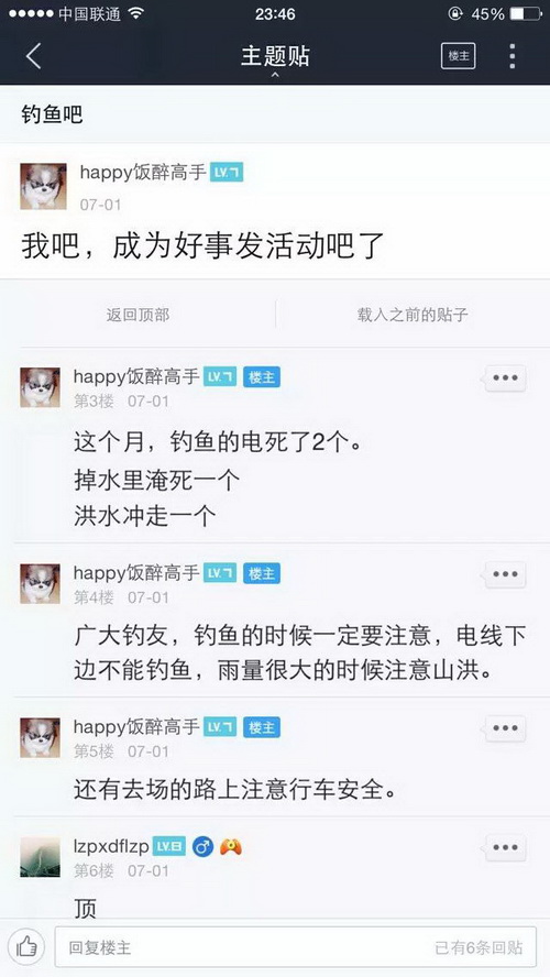 现在几乎有水有鱼的地方就有捉鱼钓鱼者,这些钓鱼捉鱼者把鱼的生命当做儿戏,肆意杀生,岂不知天下最惨者莫过于杀害生命,当然喜好杀生者也必有惨烈的报应,下面仅仅是百度贴吧里随便收集的非常少的一部分,7月份因钓鱼而死的事例,如果算上全部的以及别的网站论坛的,再加上没有发布到网络上的等等,这个数字一定是触目惊心的,这仅仅是一个月的!