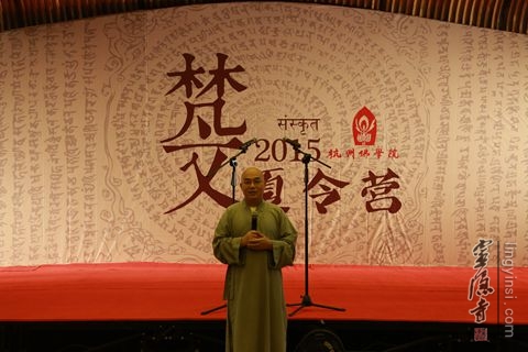 在庄严优雅动听的梵呗之后,杭州佛学院副院长刚晓法师为梵文夏令营学员们开示,他如数家珍般地回顾了杭州佛学院的历史与现况。针对首届梵文夏令营,他对我国的梵文现况作了开示,在中国,最初的梵文教学就在佛教的寺院中进行的。这种教学过程在中国持续了1000多年,为了将这种教学过程持续下去,也为中国的梵文教学与研究播洒种子,杭州佛学院发起了此次梵文夏令营,希望梵文研究与教学的种子将来能结出累累硕果。