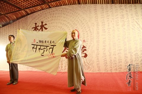 杭州佛学院梵文班的法师们为了夏令营学员演唱了《华严字母》。杭州佛学院副院长刚晓法师在开营仪式的最后,亲自为2015杭州佛学院梵文夏令营授旗。