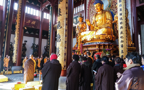 佛七现场 2018年12月18日,上午8点半许,杭州灵隐寺药师殿内经幡飘扬,梵呗声声,正式启建为期七天的戊戌冬佛七法会。在举国上下欢庆改革开放四十周年庆典之际,灵隐寺法师们以持名念佛的精进佛七法会,祈愿国泰民安,人民幸福。炉香乍热,法界蒙熏,诸佛海会悉遥闻。义广法师拈香主法 冬参夏学是佛教寺院的优良传统,灵隐寺除了每年三个月时间的华严法会以外,每年冬月都会例行安排念佛七、禅七等修学活动,以集中的修学课程提升寺院常住及广大佛弟子的修学水平。佛七法会法师持名念佛 佛七以持名念佛称念"南无阿弥陀佛"六字圣号为形式,用专注念诵的精进用功,以资信愿,从而契入净土