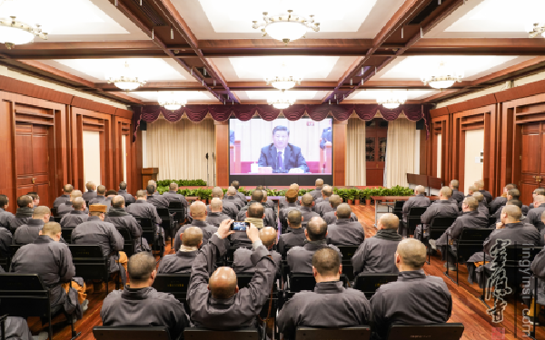 2018年12月18日,杭州灵隐寺组织僧众在华严阁学习习近平总书记在庆祝改革开放四十周年大会上的重要讲话。法师们专注聆听 通过收看讲话视频,寺院常住法师全面的了解到改革开放40周年以来党和国家的发展与壮大,感受到了改革开放给人民带来的幸福感和获得感。尤其是党的十八大以来,以习近平同志为核心的党中央,扎实推进全面深化改革的伟大实践;党的十九大,开启了建设社会主义现代化国家的新征程。40年众志成城、40年砥砺奋进、40年春风化雨,13亿中国人民正朝着"两个一百年"奋斗目标砥砺前行。活动现场 中国佛教有着爱国爱教的优良传统,国家繁荣富强是每一位佛弟子的殷切希望,佛弟子