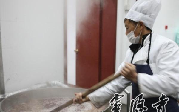 2013年1月12日,农历腊月初一,距我国传统的腊八节还有一周时间,灵隐寺斋堂腊八粥熬制现场,6口大锅一字排开,在热气腾腾之中,用心用力搅拌的身影时隐时现;另一边,居士义工们正在把熬好的腊八粥用一次性碗盛好,另外则有义工把它们放到可移动式柜架上,整齐排列,等候冷却好后进行最后的密封包装。这是二○一二年我寺腊八粥开锅熬