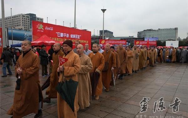 2012年12月15日,我寺30多位法师在知客心如法师的带领下,参加了在黄龙体育中心举行的"2012年杭州市‘日勤于步,健康永驻’全民健身走系列活动"最后一站活动,在点点细雨中,绕着黄龙体育中心的外场、玉古路和求是路行走一圈,带着出家人的智慧和禅意,向人们宣传以低碳的方式走出环保和谐的杭州新发展之路。