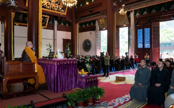 4月6日上午,杭州灵隐寺“云林讲堂”首期讲经活动在直指堂举办,邀请然教法师为大众宣讲“持名念佛与华严奥藏”。然教法师首先介绍了“华严奥藏”提出的背景。他表示,蕅益大师在《阿弥陀经要解》中将《阿弥陀经》判为“华严奥藏、法华秘髓”,将净土法门提升至一乘圆教高度,提示信愿持名即是大总持法门,一句弥陀名号即摄三藏十二部。其价值不仅在于理论精妙,更为无论根器利钝的一切众生指明了一条“即生死身,成涅槃道”的捷径。此中深意,唯信愿行者方可体悟。随后,然教法师分别从念佛与华严“法界观”的统摄、唯心净土与华严净土、念佛统摄华严“六相圆融”、念佛含摄华严“十玄门”妙义、普贤行愿与导归极乐、念佛作为“四法界观”的实