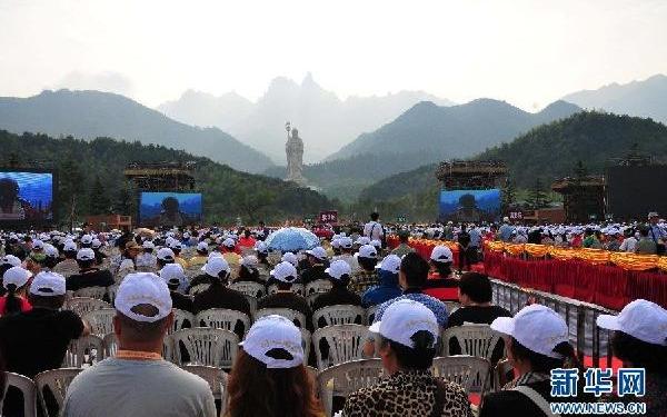 备受社会各界关注的九华山99米地藏菩萨露天大铜像,于2013年8月31日上午在九华山大愿文化园举行圣像开光庆典法会。据了解,圣像开光庆典法会由九 华山佛教协会举办。有来自世界各地的99位大德高僧参加法会。圣像开光庆典是九华山佛教史上的一次盛大法会,是九华山佛门以及风景区人民的一次大喜事。