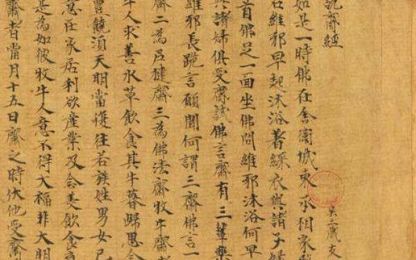 、《佛说斋经》吴月氏国居士支谦译闻如是。一时佛在舍卫城东丞相家殿。丞相母名维耶。早起沐浴着彩衣。与诸子妇俱出。稽首佛足一面坐。佛问维耶。沐浴何早。对曰。欲与诸妇俱受斋戒。佛言。斋有三辈。乐何等斋。维耶长跪言。愿闻何谓三斋。佛言。一为牧牛斋。二为尼犍斋。三为佛法斋。牧牛斋者。如牧牛人求善水草饮饲其牛。暮归思念何野有丰饶。须天明当复往。若族姓男女已受斋戒。意在家居利欲产业。及念美饮食育养身者。是为如彼牧牛人意。不得大福非大明。尼犍斋者。当月十五日斋之时。伏地受斋戒。为十由延内诸神拜言。我今日斋不敢为恶。不名有家彼我无亲。妻子奴婢非是我有。我非其主。然其学贵文贱质无有正心。至到明日相名有如故事斋如彼