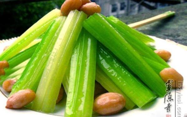【原料】:花生仁200克、芹菜250克、酱油、花生油、盐、味精、糖、白醋各适量【做法】: 1. 锅内倒入花生油,将花生仁炸一会儿; 2. 芹菜洗净、切段,用开水焯一下捞出,沥干水分; 3. 将水芹置于盘底,花生仁堆放在中间; 4. 上述调味品拌匀,淋在芹菜上面即可。 #营养提示#: 水芹性凉,味甘、苦;归肺、胃、肝经。水芹含蛋白质、脂肪、粗纤维、钙、磷、铁、芸香苷、水芹素和檞皮素等成分。具有平肝清热、祛风利湿、除烦消肿、凉血止血等功效。主治高血压、暴热烦渴、水肿等症,还可以治疗肝火上攻引起的头晕头痛。 花生性平,味甘;入脾、肺经。花生具有很高的营养价值,内含丰富的脂肪和蛋白质。据测
