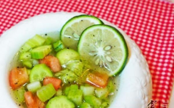 【主材】:黄瓜、圆生菜、西芹【做法】:1、所有蔬菜洗干净后,圆生菜用手撕成小块、西红柿切丁、黄瓜去皮切丁、西芹切丁 。2、切好的所有蔬菜放入大碗里,放入橄榄油、黑胡椒、盐 。3、柠檬对半切开挤汁在蔬菜上,冲入苏打水拌匀 。4、再切两片柠檬在蔬菜里,浸泡10-15分钟即可。