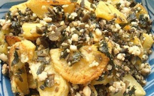 【主材】:香干、土豆、香椿【做法】:1、将土豆去皮切薄些的块,入涂油的电饼铛,洒少许盐煎熟至黄2、咸香椿一半切细,另一半切粗粒 &nb