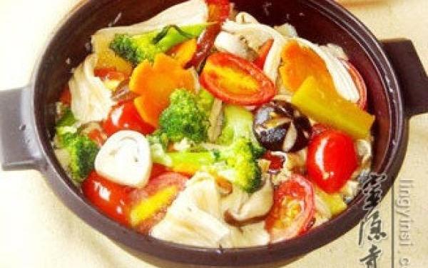 【主材】:草菇 8个 、胡萝卜 半根 、西兰花 半个、腐竹 2条 、樱桃西红柿 8个【做法】: 1、准备工作:胡萝卜削皮切花;鲜菇清洗干净后切厚片;腐竹用温水浸泡至软后切成段,西兰花清洗干净切成小朵,南瓜削皮切稍厚的片;草菇飞水后冲洗干净对半切开;圣女果清洗干净对半切开。 2、把西兰花、胡萝卜、草菇、鲜菇、南瓜放进塔吉锅,淋上适量的色拉油,加入20ml蚝油,把全部材料翻拌均匀。 3、盖上盖子,放进微波炉,高火3分钟 4、取出塔吉锅,放进腐竹、圣女果,调