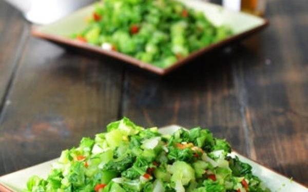 主材:芥菜、红椒做法:1、芥菜洗干净后,放锅里焯一下,时间要短,变软了就马上捞出来;焯好后的芥菜马上放入冷水中浸泡十分钟(稍长一点也没关系)。2、从冷水中拿出来稍挤干水分,切成碎,粗细可随自己喜好;用手抓一把切好的芥菜,握在手中,用力挤去多余的水分;挤好后的芥菜会成一团,用手再把菜弄散放盘子里备用;鲜红椒切丁(也可选用干红椒,会是另外一种风味)。 3、锅中放少许油烧热(五成就好),放入红椒丁炒香,然后放芥菜一同翻炒,放适量盐调味即可。
