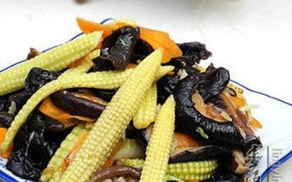 【主材】:木耳(水发)、干香菇、胡萝卜 【做法】:1、水发黑木耳掰成小片、玉米笋洗净,切开胡萝卜洗净切片。2、泡发的香菇,洗净,去掉香菇蒂。 3、斜刀切成片状。4、锅烧热,倒油,用蒜末和一半香葱末炝锅。5、放入香菇,翻炒几下 , 放入玉米笋、胡萝卜片和黑木耳。6、不停的翻炒,放入适量盐、鸡精和糖调味(放糖增鲜,有糖尿病的可不放)。出锅!