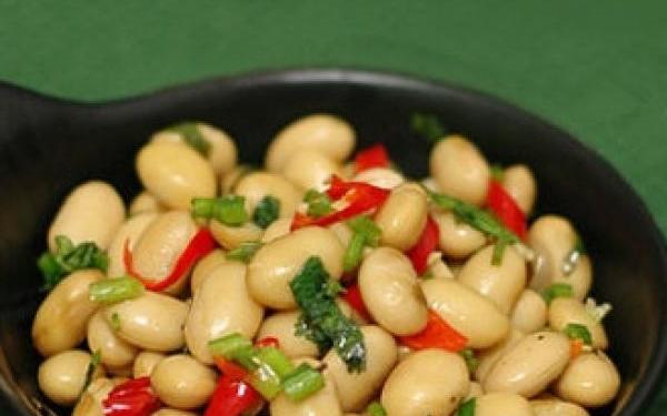 主材:黄豆、八角、老抽、香叶、红尖椒、香菜、做法:1、黄豆提前用清水泡涨。我是前天晚上泡好,第二天用的。2、锅中加少许底油,下花椒,八角,桂皮,盐,老抽,生抽,白糖,香叶炒香再加入清水,大火烧开煮至出香味。3、下入黄豆,大火烧开后转小火焖煮至自己喜欢的熟烂程度,大约30分钟左右后将黄豆捞出,挑除香料。4、香菜,小米椒洗净切末撒在黄豆上。5、加少许盐,麻油拌匀即可