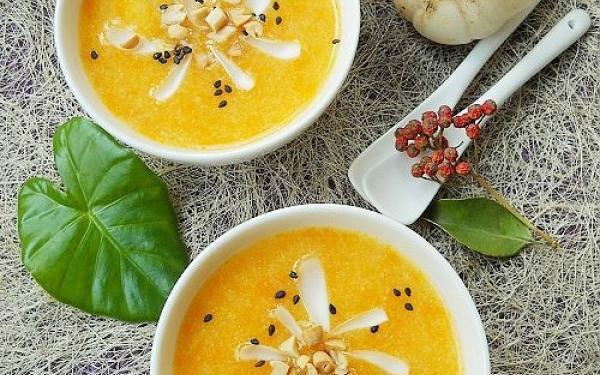 南瓜250克、圆糯米100克、新鲜百合一个、冰糖、黑芝麻、花生仁适量