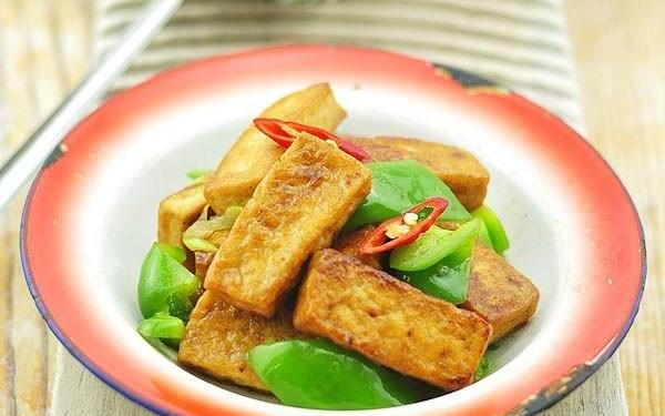 北豆腐(老豆腐) 300g、青椒 1个、鲜红辣椒 1个