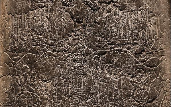1卢舍那的意思是“光明遍照”,法界人中像是卢舍那佛的一种形式,从华严信仰而来,即基于《华严经》的法界观,在佛像表面刻绘诸世界形象,表示整个法界皆由卢舍那佛的愿力所化现,借以反映观想所产生的世界形象,实现法界思想的具象化。“人中像”的人中二字意指“人体之中”,旨在表达《华严经》所说的“无等平等妙法界,悉皆充满如来身”、“佛身充满诸法界,普现一切众生前”的观念,故人中像一定在卢舍那佛的身上描绘法界诸相,以阐明在卢舍那佛的法身中,法界诸像无一不现的道理。2“法界人中像”基本出现在5世纪的北朝晚期,多为北齐、北周,存世的卢舍那佛法界人中像仅有几处:一、美国弗利尔美术馆所藏,卢舍那佛法界人中像。二、山东