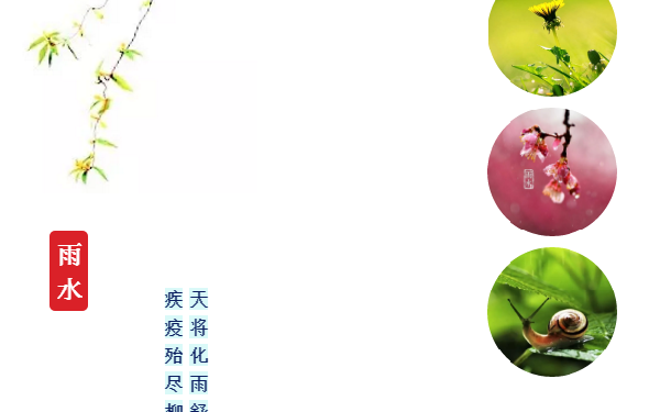 雨水时间阳历: 2020年2月19日(星期三)农历: 庚子 正月 廿六节气交节时间: 12:56:53 雨水,二十四节气的第二个节气,也是春季的第二个节气。斗指壬,太阳到达黄经330°,每年公历2月18-20日交节。《月令七十二侯集解》:正月中 天一生水春始属木 然生木者必水也故 立春后继之雨水且东风既解冻 则散而为雨故名为雨水 雨水和谷雨、小满、小雪、大雪等节气一样,都是反映降水现象的节气,是古代农耕文化对于节令的反映。雨水节气意味着进入气象意义的春天。 雨水节气,春风送暖,雨水增多。此时我国北方阴寒未尽,尚未入春,仍会下雪很冷;南方大多数地方则已进入早春,一片春意