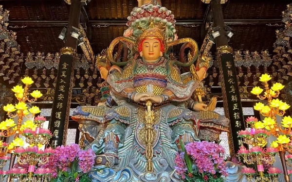 一般韦驮菩萨塑像都是立像,而在浙江临安天目山却是坐像,这是为什么呢?我们不妨先说个故事——高峰原妙禅师(1238—1295)是临济宗雪岩祖钦禅师最著名的弟子。苏州吴江人,十五岁出家,十七岁受具足戒,先学天台教义,二十岁到杭州净慈寺拜谒断桥妙伦禅师,立死限三年,勤苦修道。后参叩雪岩祖钦,终获法意。至元十六年(1279),高峰禅师来到天目山西峰,于师子岩修葺茅棚居住。高峰禅师当初每一坐禅就打盹,一睡就不得入定,昏沉特别重。高峰禅师想找一个方法来对治昏沉,便在西天目的倒挂紫金钟(一处非常有名的山崖)上面去打坐,如果一昏沉睡觉,就会跌到山涧下去。山涧有几千万丈高,如果从上面跌下来,肯定粉身碎骨。高峰禅