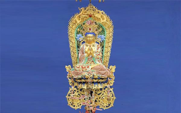 杭州佛学院艺术院,旨在发挥佛教艺术净化人心的积极作用,培养具有一定的佛教艺术鉴赏能力与佛教艺术创作的人才。最近,杭州佛学院艺术院造像专业研究生制作了一批佛教造像和金银器,殊胜庄严,美轮美奂,请您欣赏。 多宝如来造像 多宝如来之名出自《法华经》,是东方宝净佛国的教主。隋唐时期法华信仰盛行,各大石窟皆有多宝如来圣像遗存。作者因有感于如今法华信仰落寞,不单名号持诵者少,连造像也难以见着,遂发心参阅石窟及博物馆遗存,又翻阅典籍,用佛教七宝材质塑造多宝如来。 整尊造像通高三尺五寸半,宽一尺三寸,采用大漆脱胎传统工艺,底座及中心柱用木雕贴金,装染部分为矿物色,又嵌以佛家七宝,珊瑚、水晶、珍珠等,