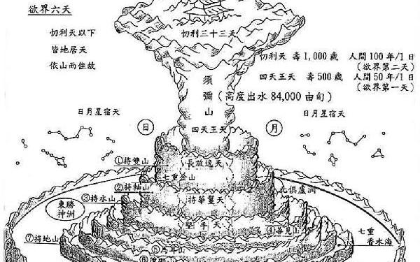 人四洲 多思虑故名之为人。人处有四洲之别。中须弥山为一小世界之中心,由有情业力,从空界中,十方风起,互相冲激坚密不动为妙风轮。次起金藏云遍布虚空,大洪雨降注风轮上,结为水轮。次起风,击此水,令上结成金,为金地轮,于金轮上有九山,须弥山(译云妙高)处中而住,出水八万由旬,入水亦然。 此须弥高山外有持双、持轴、檐木、善见、马耳、象鼻、持边,七重金山围绕之,是为一小世界。须弥山与七山间,各有大海,名为内海。七山外有咸海以铁围山为限,此为外海。外海即咸海,四方有四大洲,亦云四天下。南瞻部洲,此洲有瞻部林,树形高大,其果甘美。东胜身洲,身形胜故。西牛货洲,以牛为货。北俱卢洲,于四洲中,国