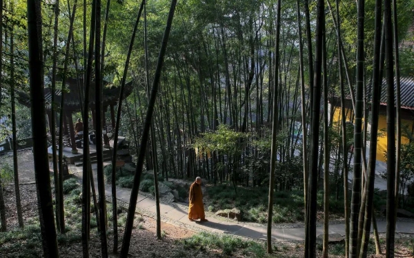 题西湖僧舍壁【宋】清顺法师竹暗不通日,泉声落如雨。春风自有期,桃李乱深坞。苏东坡结识清顺实由缘份使然。熙宁五年(1072),苏东坡在仁和县汤村镇开运河,有一天即兴游览西湖,“于僧舍壁间见小诗(即清顺《题西湖僧舍壁》),问谁所作?或告以钱塘僧清顺,即日求得之,一见甚喜,而顺之名出矣”(《宋诗纪事》卷九一)。之后二人交游唱酬,互相往来。这首五言绝句清丽、自然、简约。首句重在一“暗”字,翠竹遮天,郁郁葱葱,表现了丛林寺宇的幽寂。“泉声落如雨”,以动衬静,泉声清淙,飞落如雨,形象生动地将林间的清幽表现得如绘如织,予人以动态之美。“春风自有期,桃李乱深坞”,一个“自”和一个“乱”字极具禅趣,花草树石虽是