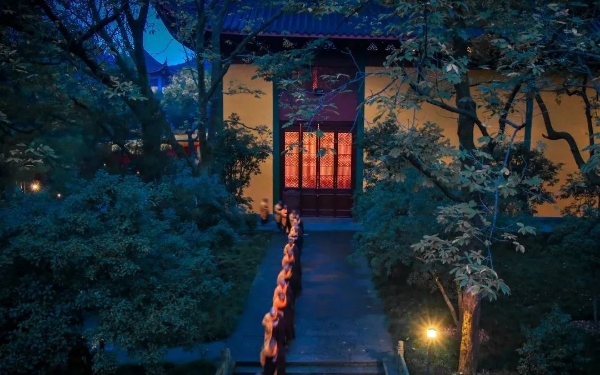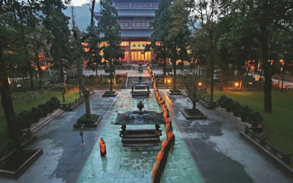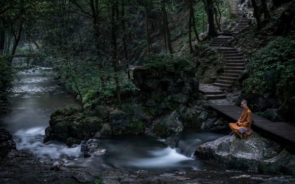 寄月禅师【宋】明教契嵩禅师闻道安禅处,深萝任隔溪。清猿定中发,幽鸟座边栖。云影朝晡别,山峰远近齐。不知谁问法,雪夜立江西。本诗清雅神妙,令人叹服。“闻道安禅处,深萝任隔溪”,禅师禅坐修行之所,溪流淙淙,林萝青葱,环境极其幽静。“清猿定中发,幽鸟座边栖”,在禅定中清猿轻轻地走开;正坐时,幽鸟栖息一旁,仿佛亦在修禅入定。自然界的生灵与禅师多么和谐地相处在一起,俨然一幅禅意连连的画卷。“云影朝晡别,山峰远近齐”,山光云影朝夕错落有致,远近高低的山峦也朦胧中成了共性的一体。大自然迷离幻化,变化多姿。自然的无穷造化即是常住真心,吾人个个具足,不假外求。“不知谁问法,雪夜立江西”,尾联宛似神来之笔,气蕴超