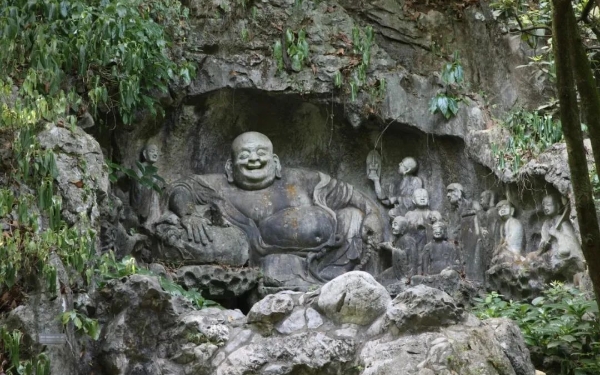 / 布袋和尚坐化纪念日 /2023年4月22日只个心心心是佛,十方世界最灵物。纵横妙用可怜生,一切不如心真实。腾腾自在无所为,闲闲究竟出家儿。若睹目前真大道,不见纤毫也大奇。万法何殊心何异,何劳更用寻经义。心王本自绝多知,智者只明无学地。非圣非凡复若乎,不疆分别圣情孤。无价心珠本圆净,凡是异相妄空呼。人能弘道道分明,无量清高称道情。携锡若登故国路,莫愁诸处不闻声。——布袋和尚布袋和尚是五代后梁时期应现于明州奉化的一位高僧,因常背负一只布袋,又称布袋和尚,因为被后世视为弥勒菩萨化身,他的故事在民间广为流传。唐末的一天清晨,奉化长汀村前的江中水声大作,波涛轰鸣。正在田间劳作的村民张重天见惯了春汛的