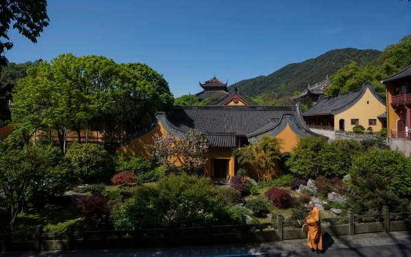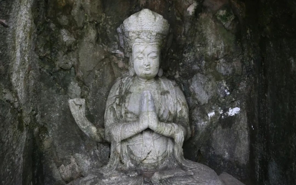 题万道人禅房【唐】张祜何处凿禅壁,西南江上峰。残阳过远水,落叶满疏钟。世事静中去,道心尘外逢。欲知情不动,床下虎留踪。相传达摩祖师曾经到达金陵,与梁武帝对答问佛,却未能意气相投,于是渡过长江来到洛阳,“寓止于嵩山少林寺,面壁而坐,终日默然。人莫之测,谓之壁观婆罗门”(《五灯会元》卷一)。因此该诗首联“何处凿禅壁?西南江上峰”,诗人自问自答,万道人在何处开凿禅壁,原来是开凿在西南江边的山峰之上。万道人凿壁于江边山峰之上,是否也有效法达摩祖师之意呢?颔联“残阳过远水,落叶满疏钟”描写了诗人的所见所闻,西下的夕阳从远处江中的水面掠过,落叶从眼前飘过,稀疏的钟声回荡在耳边,营造出了一种静寂、悠远的禅境